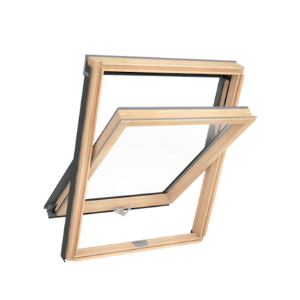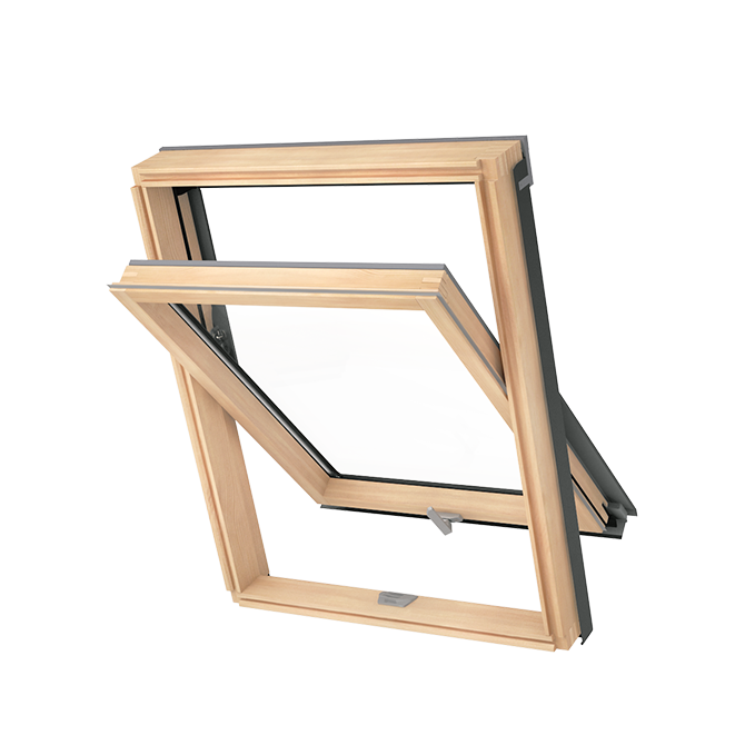 The wood of this centre-pivot roof window is protected against dirt and moisture.