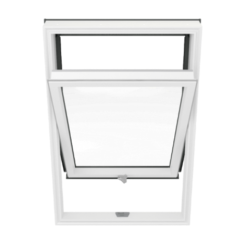 Elegant, white centre-pivot roof window with electric operation. Comes with a wall switch.