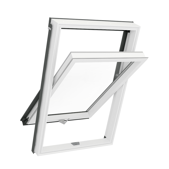 The centre-pivot roof window's white frame blends seamlessly into your home decor.